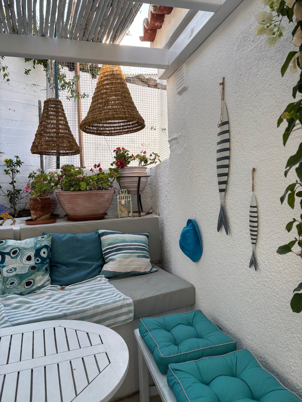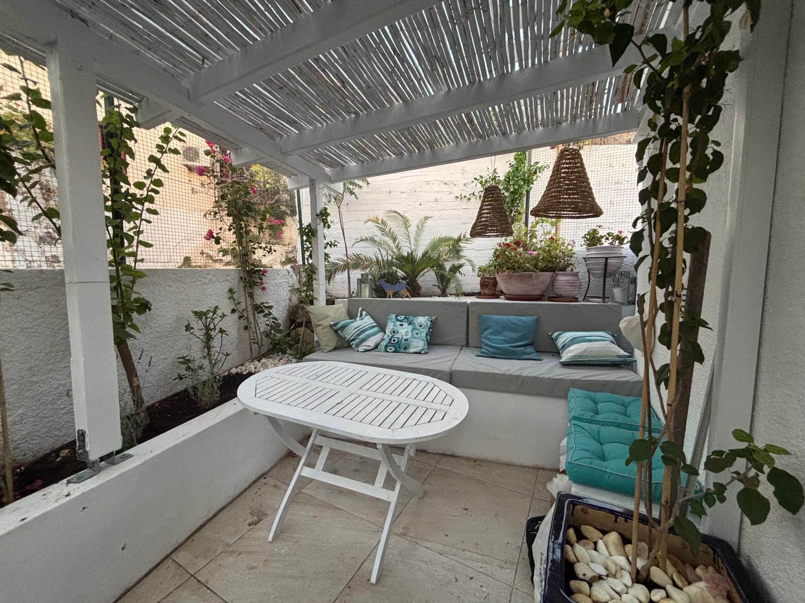 A cosy courtyard with a well-maintained garden and a sitting area shaded by a pergola offers the perfect setting for relaxing moments with family and friends.